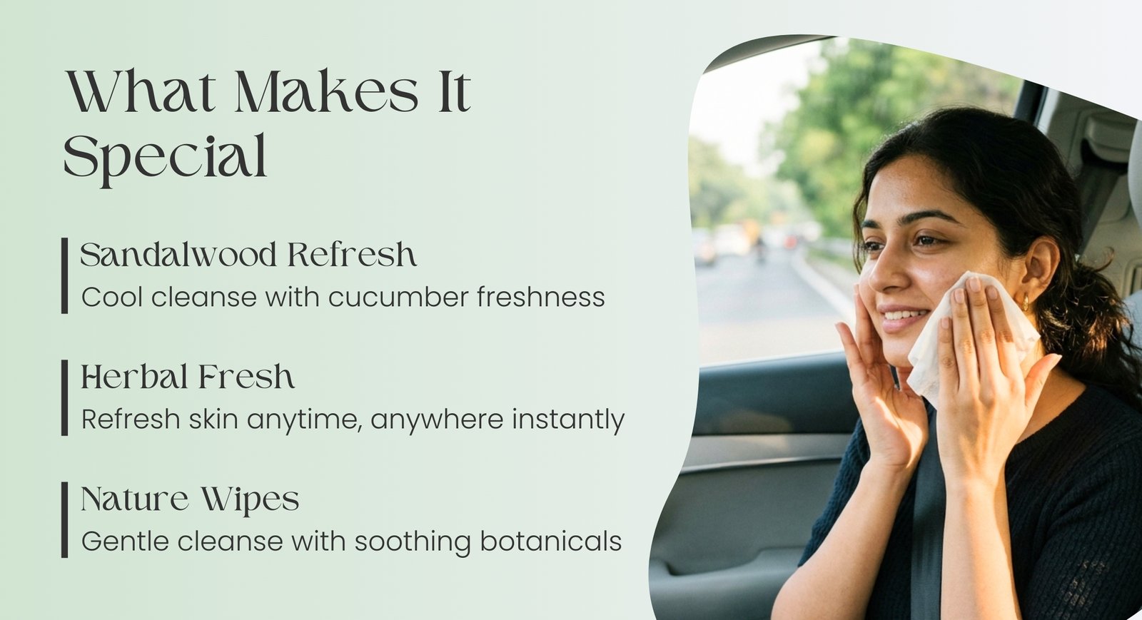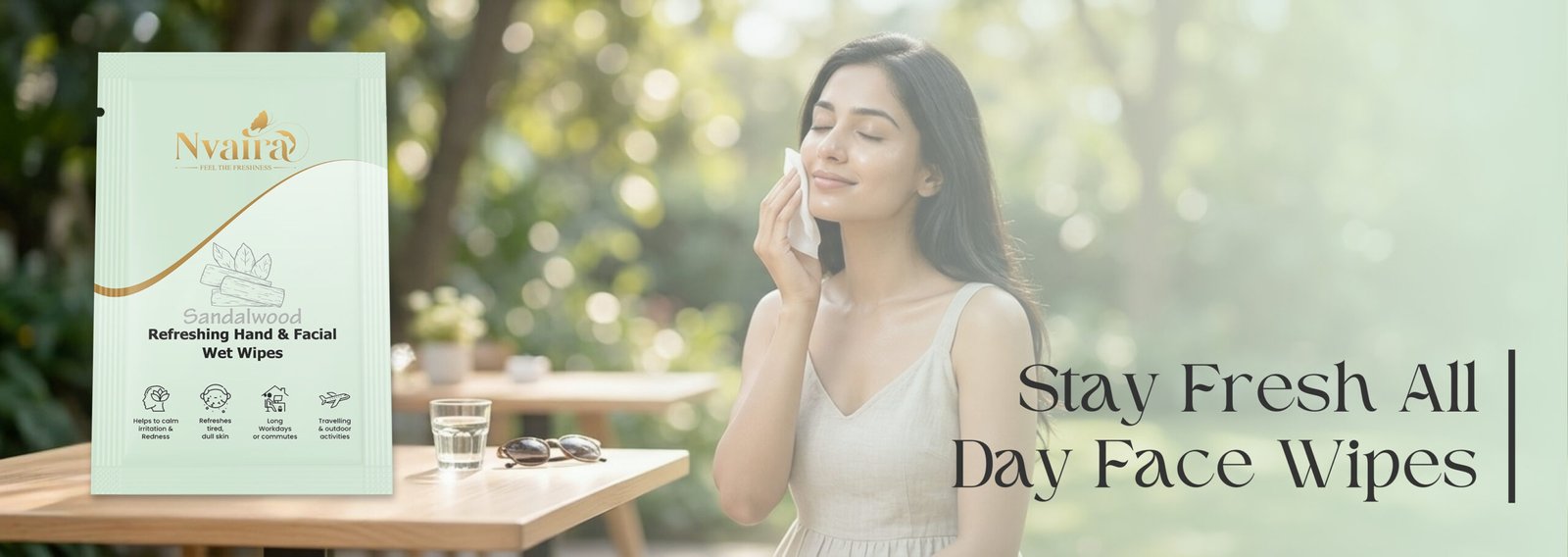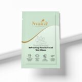 Nvaira Refreshing Hand & Facial Wet Wipes gently cleanse hands and face while delivering a cooling and calming skincare experience. Infused with cucumber and sandalwood extracts, these wipes help remove dirt, oil, and sweat without stripping natural moisture. Each pack contains 50 pieces, with a cost of ₹6 per single wipe.