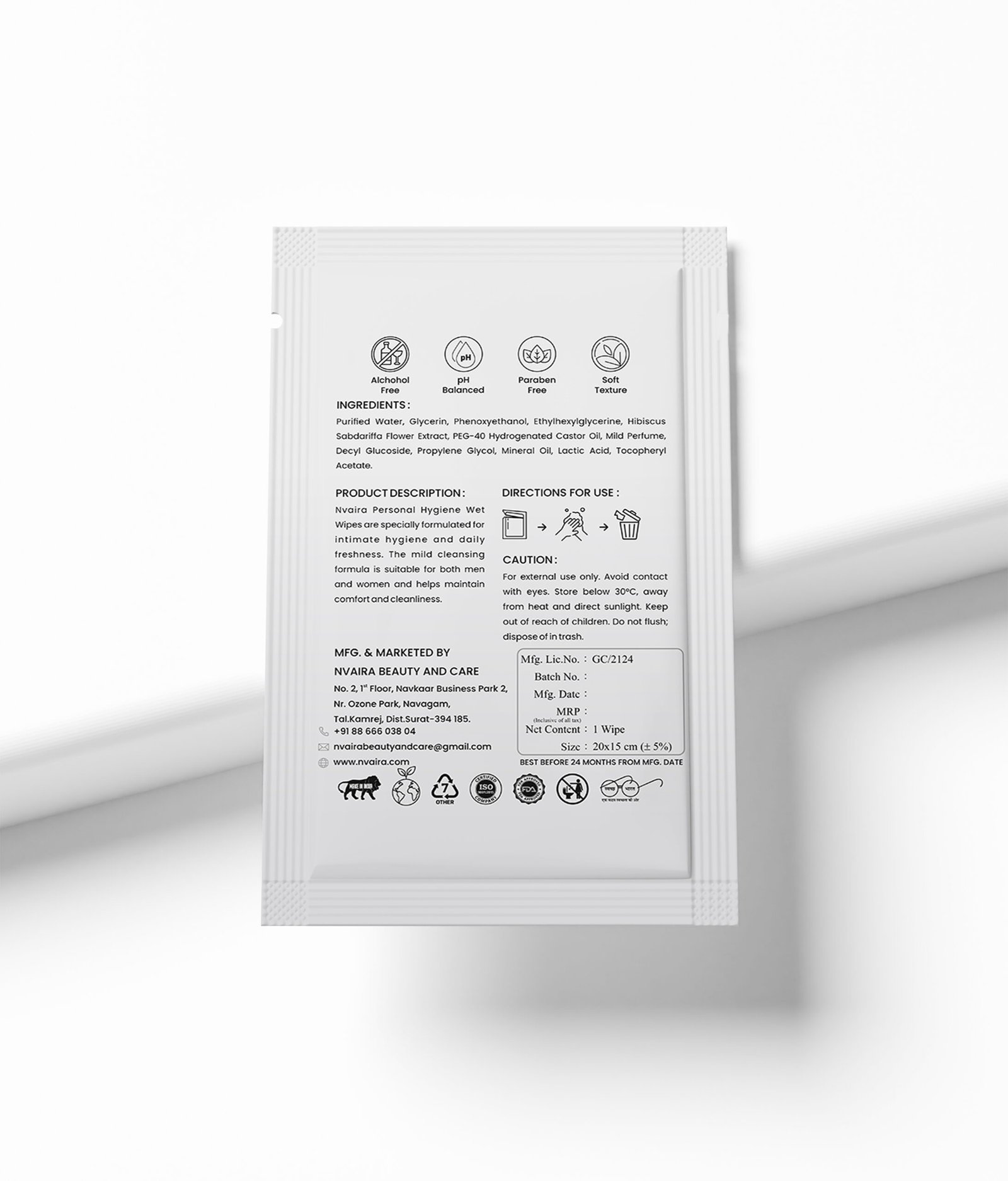 Nvaira Personal Hygiene Wet Wipes are specially formulated for intimate hygiene and daily freshness. The mild cleansing formula is suitable for both men and women and helps maintain comfort and cleanliness. Each pack contains 50 pieces, with a cost of ₹8 per single wipe.